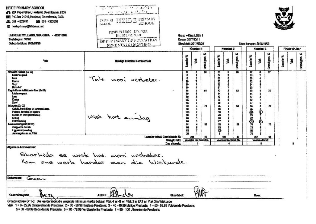 Baie dankie vir al die opoffering wat julle doen om ons kind op standaard te bring, ons is baie tevrede.
