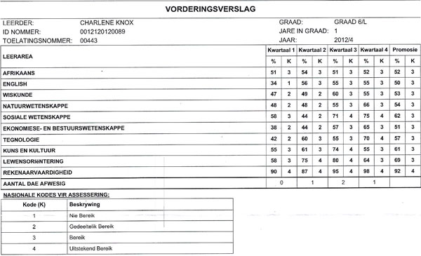 Vanaf die die eerste tot die vierde kwartaal het Charlene se persentasies soos volg gestyg: 6% in Lewensoriëntering, 8% in Rekenaargeletterheid, 8% in Wiskunde, 17% in Sosiale Wetenskappe, 18% in Natuurwetenskappe, 21% in Engels, 27% in Ekonomiese – en Bestuurswetenskappe, en 28% in Tegnologie: