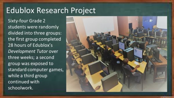 Sixty-four Grade 2 students were randomly divided into three groups: the first group completed 28 hours of Development Tutor over three weeks; a second group was exposed to standard computer games, while a third group continued with schoolwork. The pre- and post-assessments were conducted by independent speech and language therapists using the Test of Auditory Processing Skills (TAPS-3). Three sub-tests were used to assess auditory memory for numbers, words and sentences. Following the project, Edublox supplied access to Development Tutor to all Grade 2’s to adhere to ethical research practices.